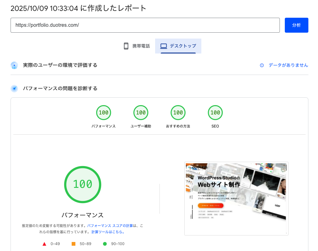 今までは80点、90点を超えるような対策を行なっていましたが、今回は100点を取るために細かく対策を行い、結果としてデスクトップ、モバイルともに100点を取ることができました。